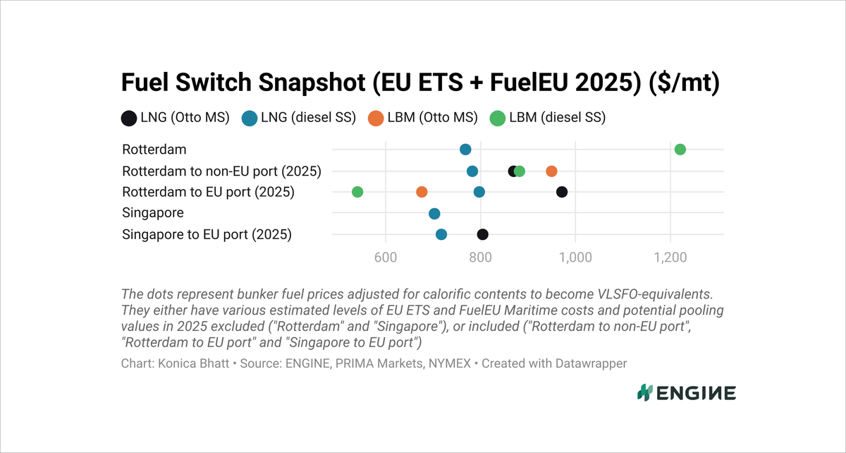 Only a few dual-fuel shipowners will directly choose between liquid biomethane (LBM) and B100, as these fuels typically serve different vessel segments. But for those still considering both options, EU regulations have now made LBM cheaper than B100 in Rotterdam, regardless of the gas engine type.