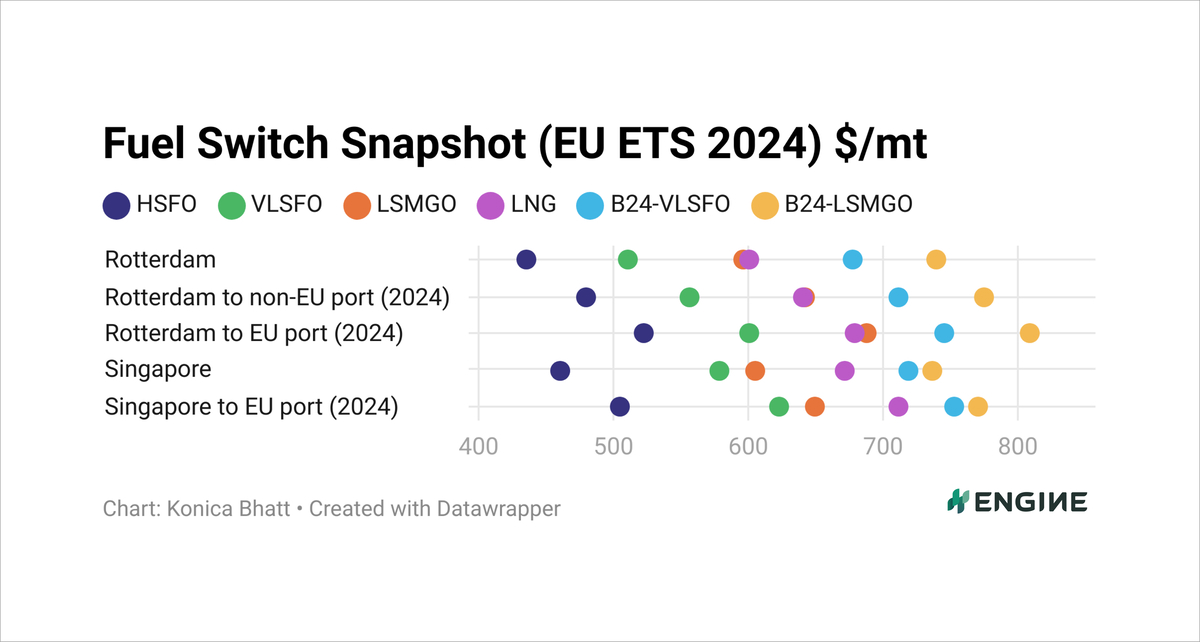 CHART: The dots represent bunker fuel prices adjusted for calorific contents to become VLSFO-equivalents, and with various estimated levels of EU ETS costs in 2024 excluded (Rotterdam) and included (Rotterdam to non-EU port and Rotterdam to EU port). ENGINE, PRIMA Markets, NYMEX
