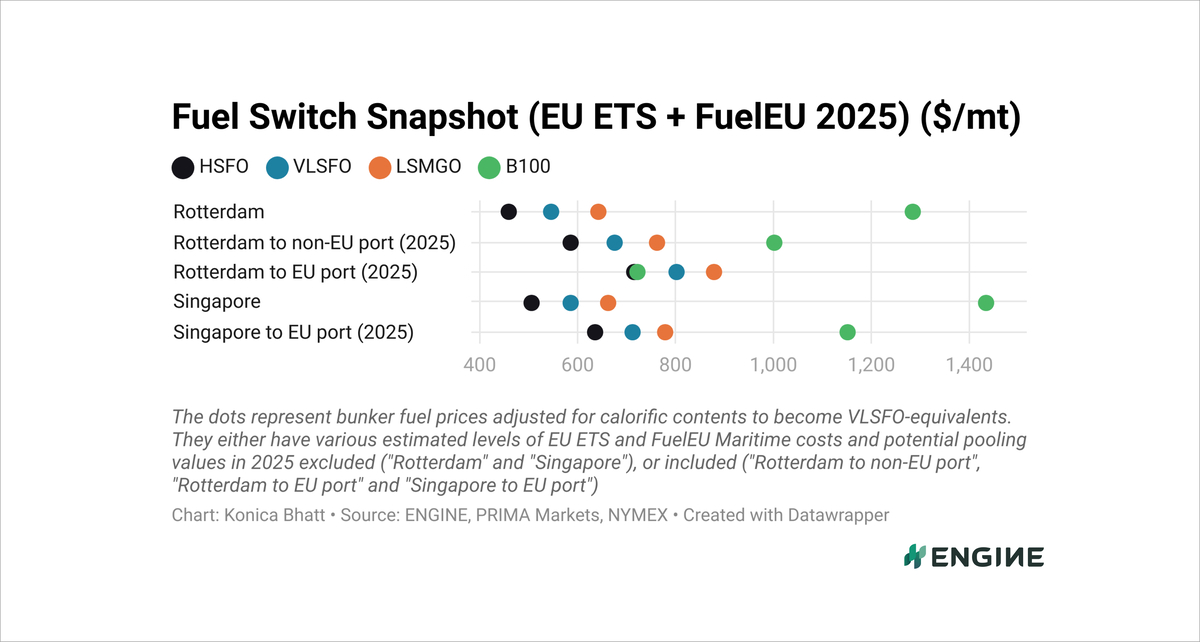 For ships with Otto MS engines, LBM’s discount to B100 has widened to $25/mt when accounting for EU ETS compliance costs and FuelEU pooling benefits. This is an $11/mt increase from a week ago.
