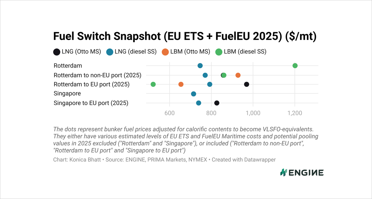 Even after factoring in EU-EU port compliance costs and estimated FuelEU Maritime pooling benefits, LNG remains $173/mt costlier than VLSFO.