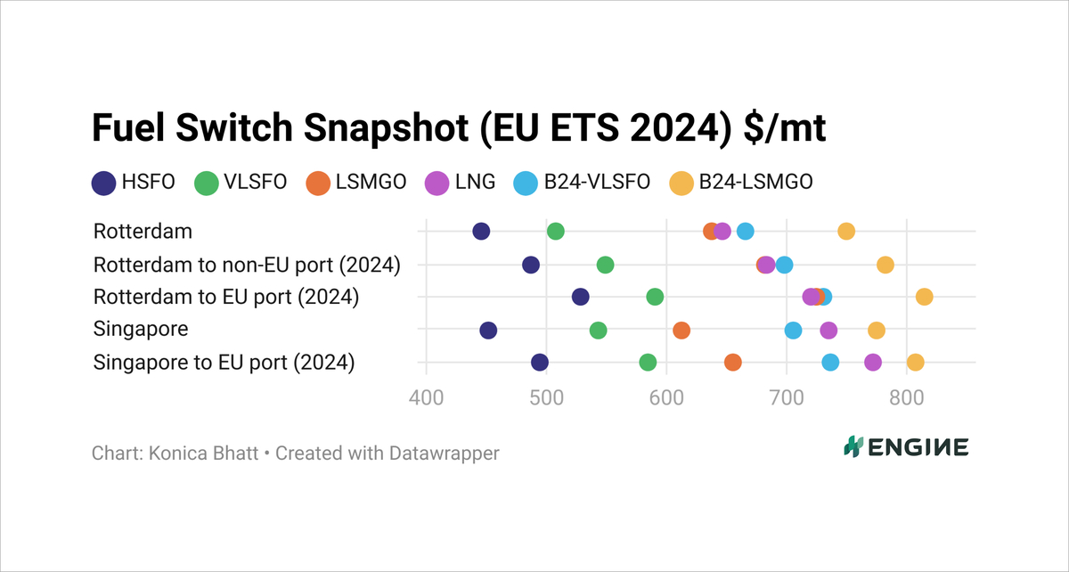 CHART: The dots represent bunker fuel prices adjusted for calorific contents to become VLSFO-equivalents, and with various estimated levels of EU ETS costs in 2024 excluded (Rotterdam) and included (Rotterdam to non-EU port and Rotterdam to EU port). ENGINE, PRIMA Markets, NYMEX