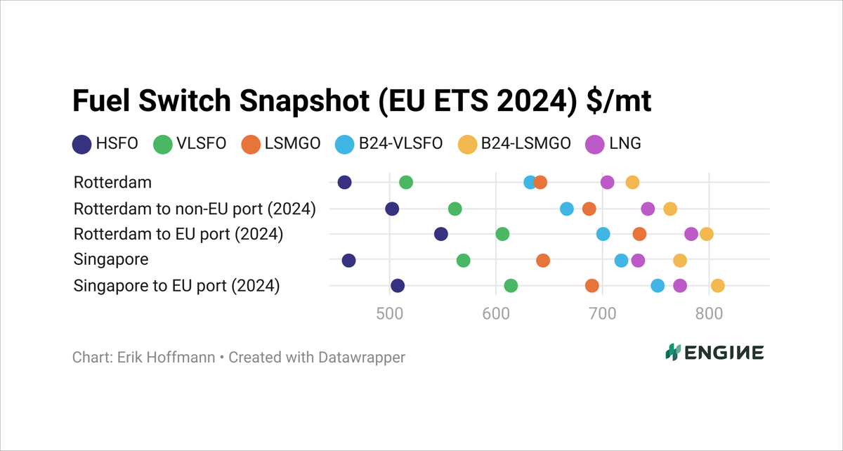 CHART: The dots represent bunker fuel prices adjusted for calorific contents to become VLSFO-equivalents, and with various estimated levels of EU ETS costs in 2024 excluded (Rotterdam) and included (Rotterdam to non-EU port and Rotterdam to EU port). ENGINE, PRIMA Markets, NYMEX