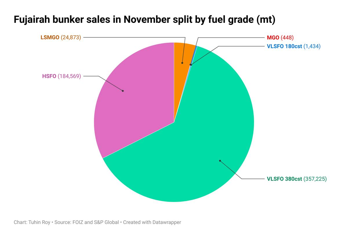 Lower VLSFO, LSMGO and HSFO sales have contributed to dragging Fujairah’s total bunker sales down by 7% in November, according to data from the Fujairah Oil Industry Zone (FOIZ) and S&P Global Commodity Insights.