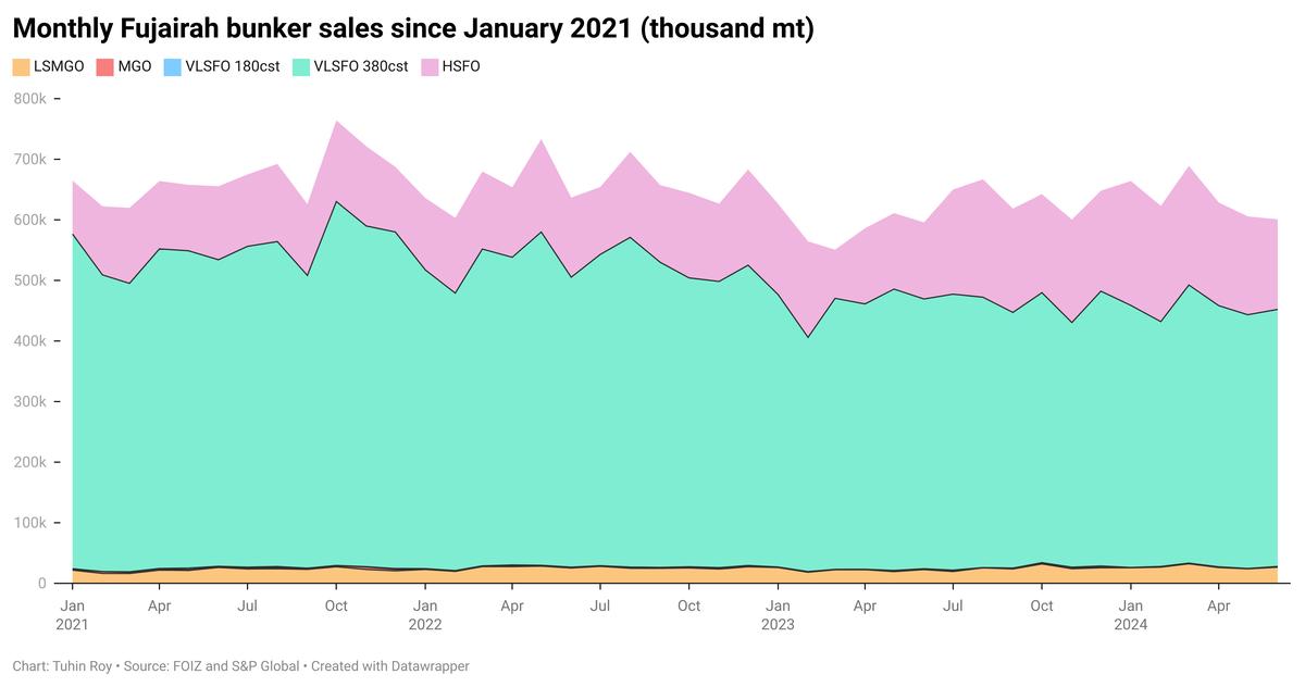 Lower HSFO sales contributed to drag down Fujairah’s total bunker sales by 1% in June, according to data compiled by Fujairah Oil Industry Zone (FOIZ) and S&P Global Commodity Insights.