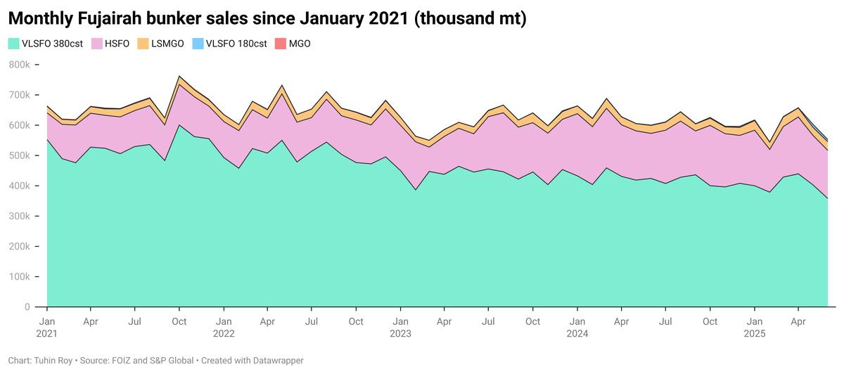 Fujairah’s bunker sales fell to their lowest level since February, averaging around 18,000 mt/day in June—a drop of about 1,000 mt/day compared to May.