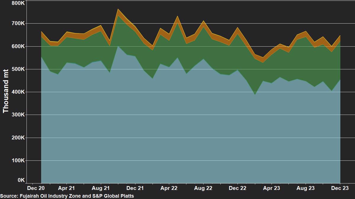 Lower VLSFO and LSMGO sales contributed to drag down Fujairah’s total bunker sales by 7% in 2023, according to data compiled by Fujairah Oil Industry Zone (FOIZ) and S&P Global Commodity Insights.
