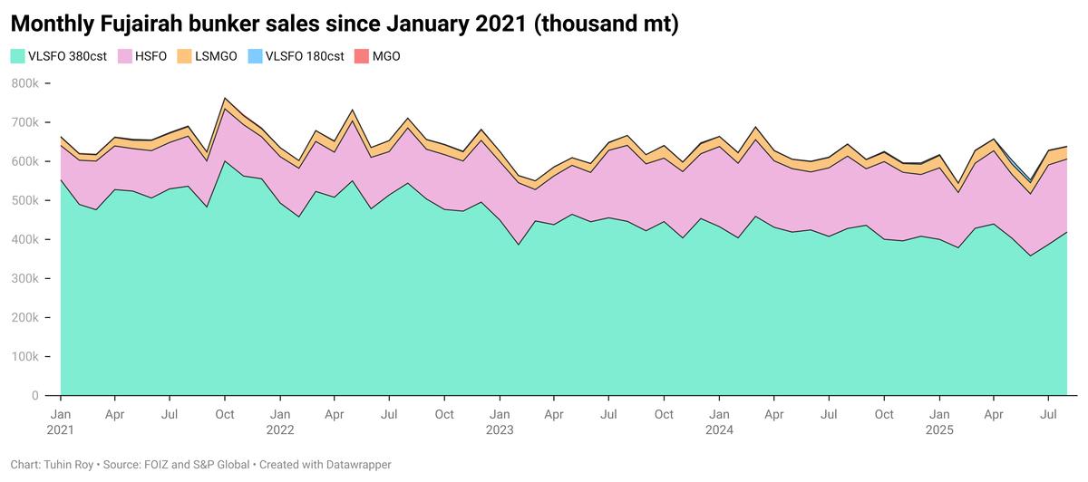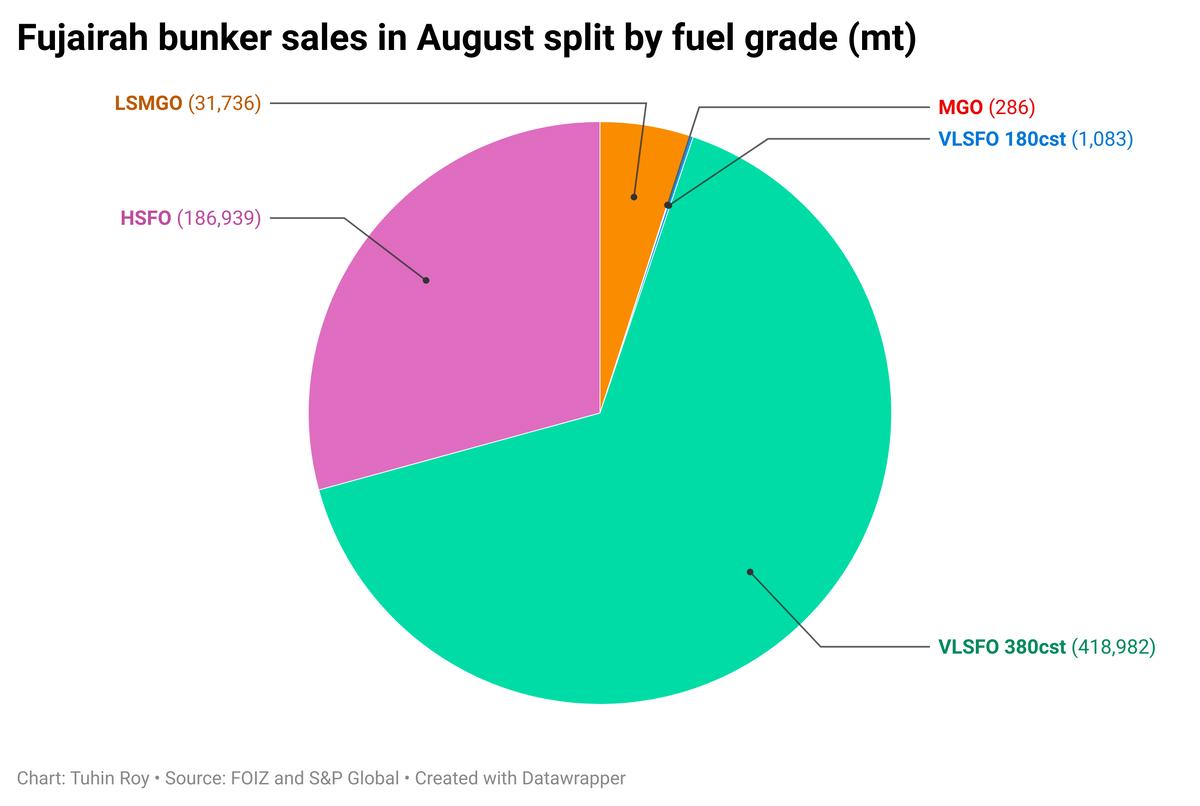 Increased sales of VLSFO contributed to lift Fujairah’s total bunker sales higher in August than in July, according to data compiled by Fujairah Oil Industry Zone (FOIZ) and S&P Global Commodity Insights.