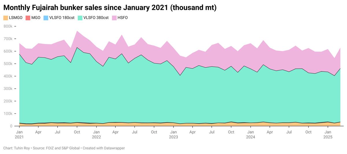 Increased sales of VLSFO, LSMGO and HSFO pushed Fujairah’s total bunker sales higher in March than in February, according to data compiled by Fujairah Oil Industry Zone (FOIZ) and S&P Global Commodity Insights.