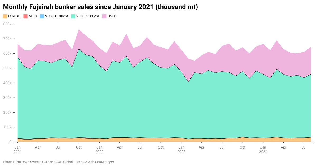 Increased sales of VLSFO, LSMGO and HSFO contributed to lift Fujairah’s total bunker sales higher in August than in July, according to data compiled by Fujairah Oil Industry Zone (FOIZ) and S&P Global Commodity Insights.