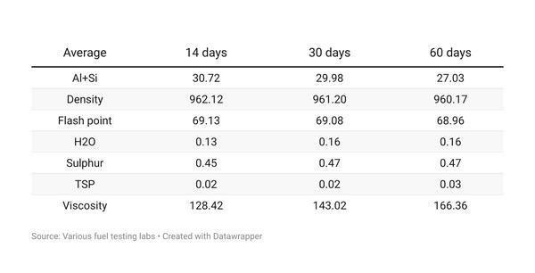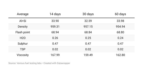 Typical VLSFO qualities in Fujairah based on 14 fuel samples over the past 14 days (caution: few samples).