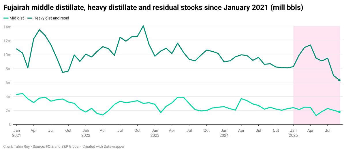 Fujairah’s heavy distillate and residual fuel oil inventories have dropped below 7 million bbls, reaching multi-year lows.