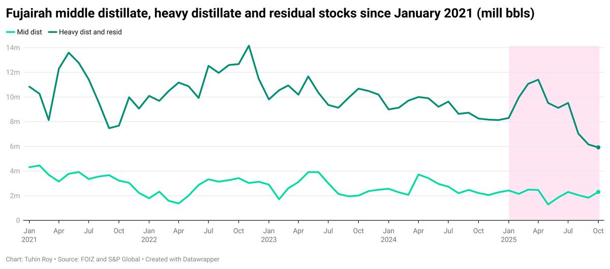 Fujairah’s heavy distillate and residual fuel oil inventories have fallen below 6 million bbls, marking multi-year lows.