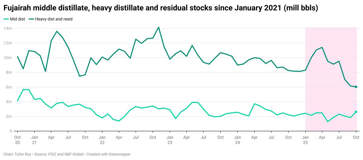 Fujairah’s heavy distillate and residual fuel oil inventories have fallen below 7 million bbls, marking multi-year lows.