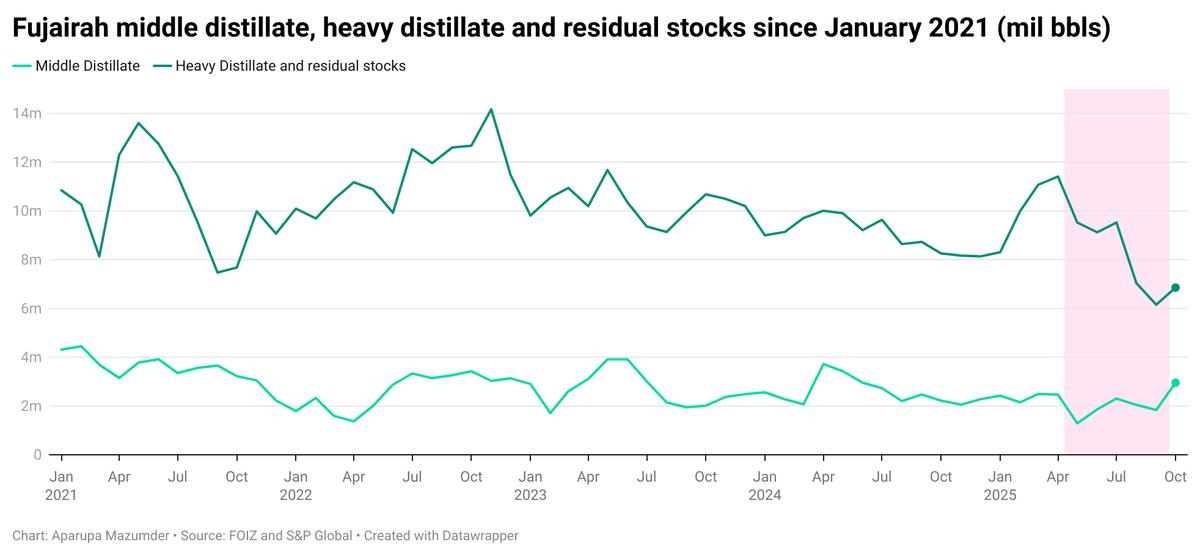 Fujairah’s heavy distillate and residual fuel oil inventories have risen from September levels but remain below 7 million bbls so far this month.