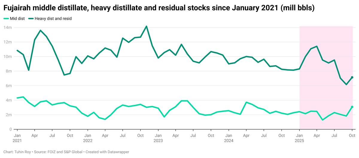 Fujairah’s heavy distillate and residual fuel oil stocks climbed back above 7 million bbls in October, recovering from multi-year lows recorded in September.