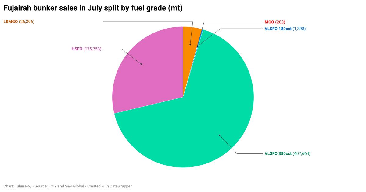 A spike in HSFO sales contributed to lift Fujairah’s total bunker sales higher in July than across June, according to data compiled by Fujairah Oil Industry Zone (FOIZ) and S&P Global Commodity Insights.