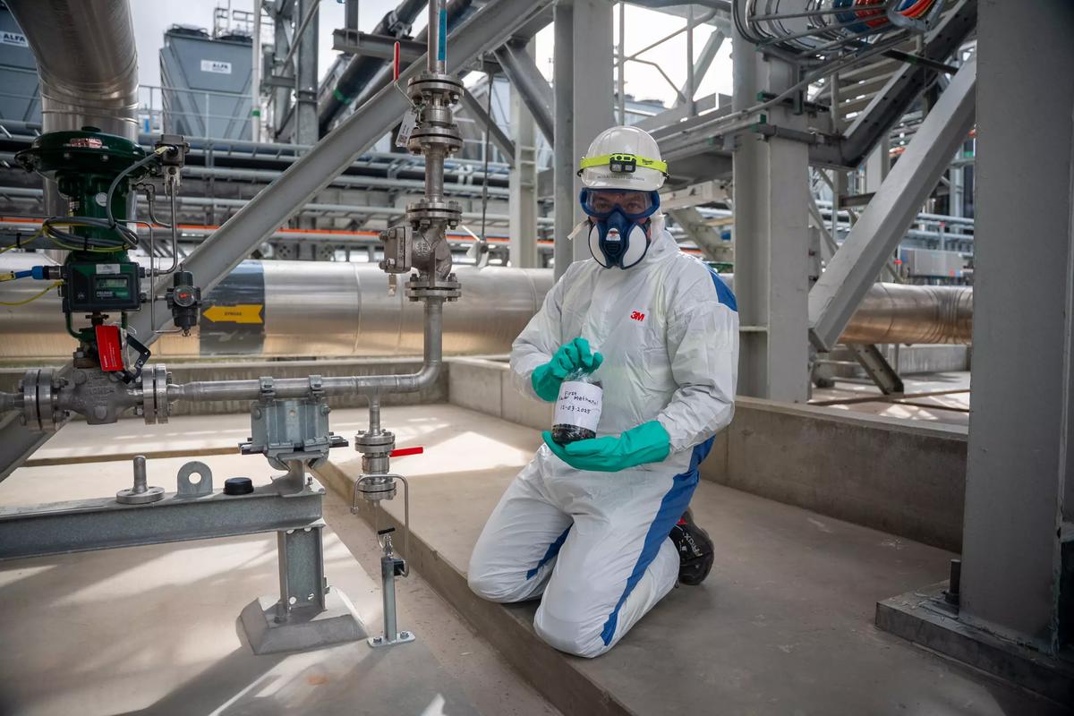 IMAGE: Technician showing first batch of e-methanol produced at European Energy's Kassø plant in Denmark. European Energy