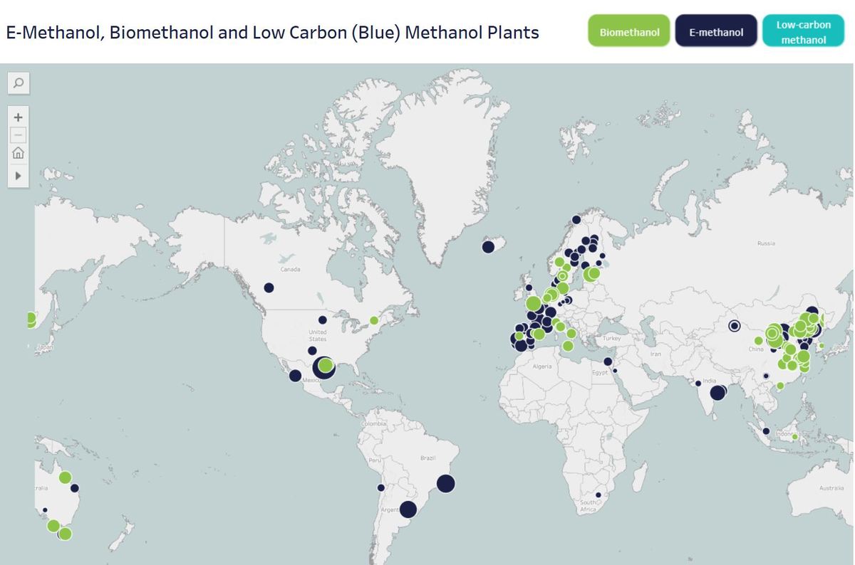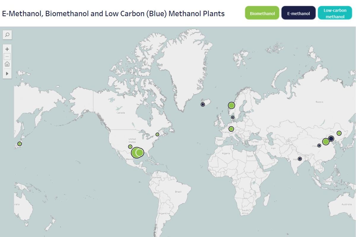 MAP: World map showing currently operational bio- and e-methanol plants. Methanol Institute via Gena Solutions