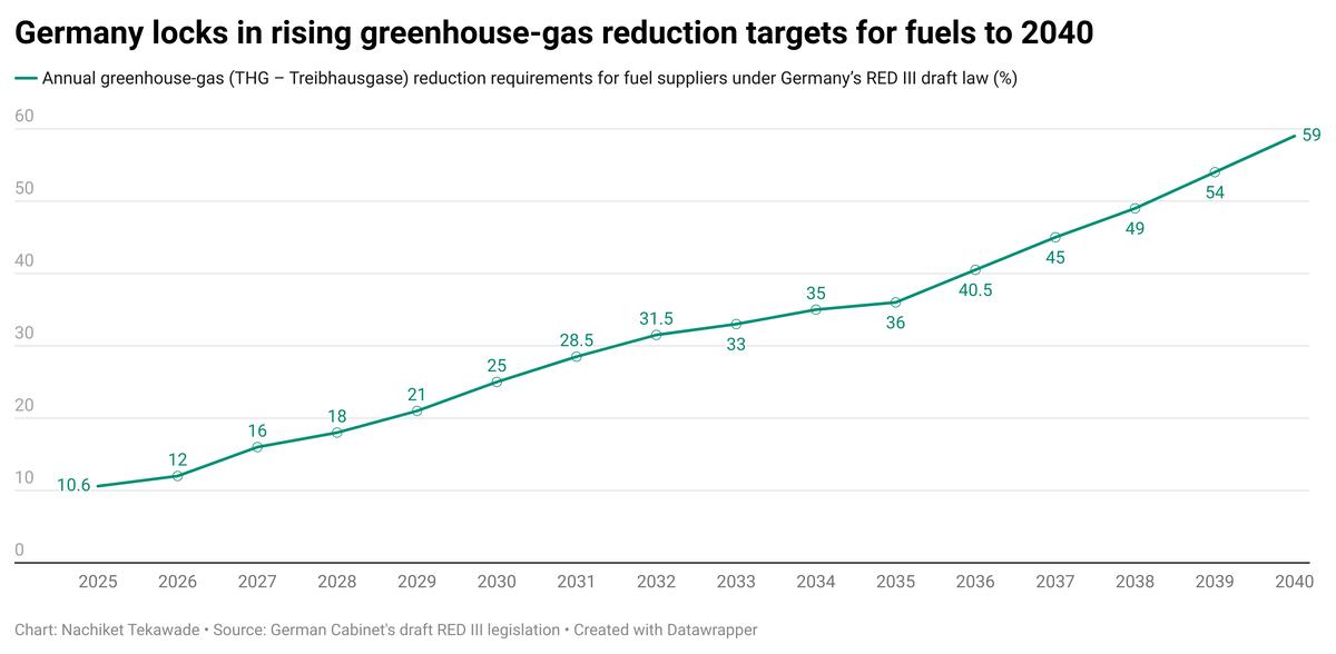 According to the draft, fuel suppliers would be required to reduce the greenhouse gas (GHG) intensity of the fuels they sell. The baseline GHG intensity in RED III is 94 grams of carbon dioxide-equivalent per megajoule of energy (94 gCO2e/MJ), and Germany is set to mandate a 12% reduction next year, rising to a 59% by 2040.