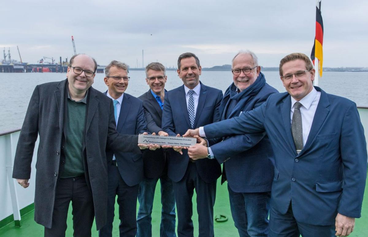 PHOTO: Germany's Ministry of Economic Affairs, Transport and Construction Olaf Lies (middle) inaugurates Wilhelmshaven’s floating LNG terminal. Niedersachsen Ports