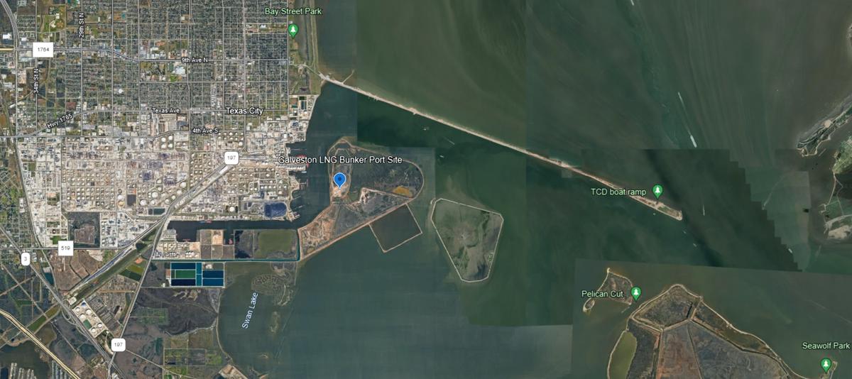 MAP: Proposed location (blue) of the LNG bunker port in Texas City, US. GLBP