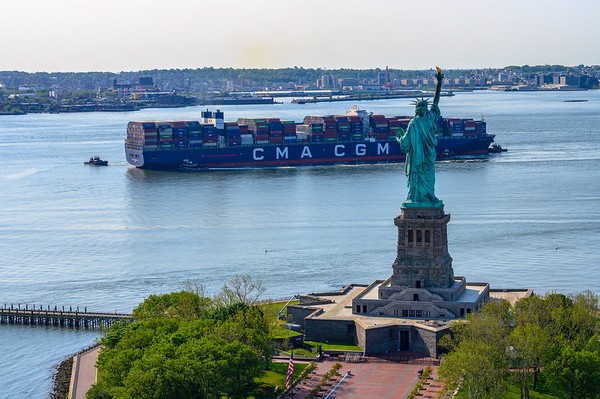 PHOTO: Container vessel sailing in front of the Statue of Liberty. Port of New York and New Jersey