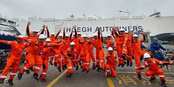 IMAGE: Höegh Autoliners’ dual-fuel LNG vessel Höegh Sunrise with its crew in the front. Höegh Autoliners