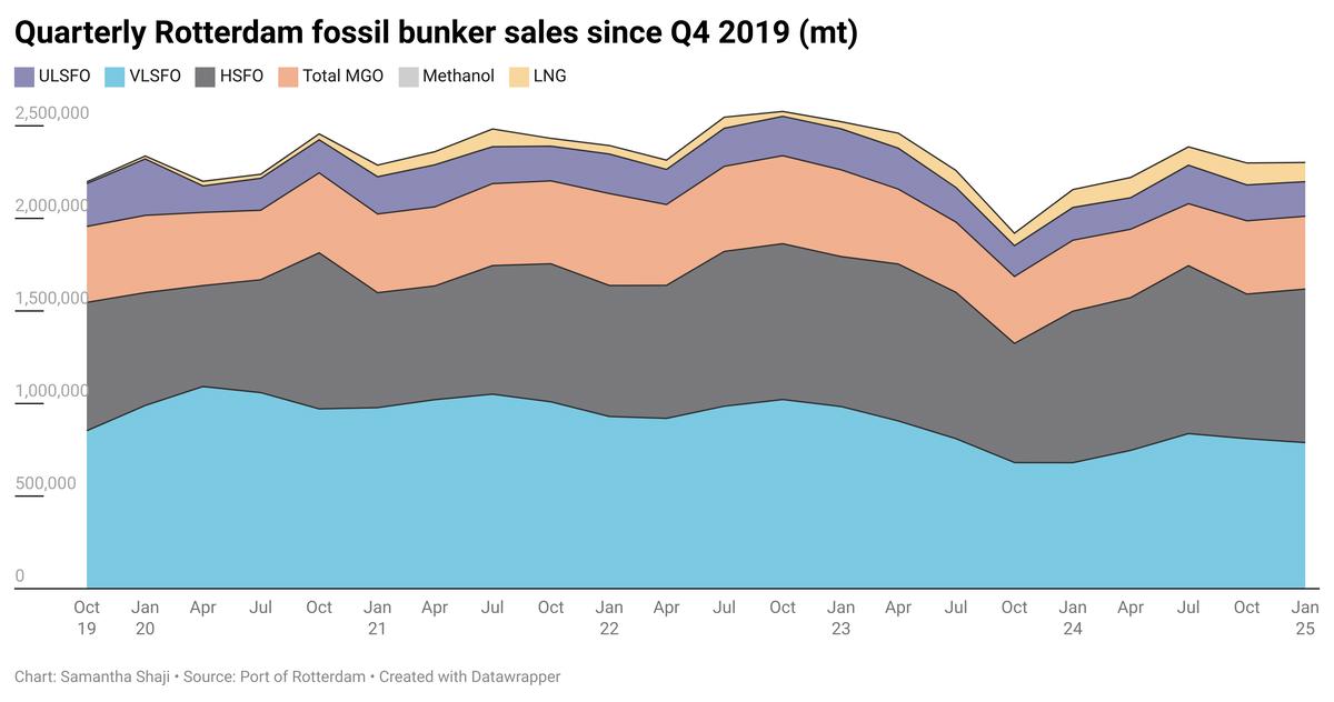 Rotterdam suppliers delivered a total of 2.30 million mt of conventional fuels in the first quarter. That was roughly steady with the fourth quarter of 2024, but a 7% increase compared to the same period last year, when the supply amounted to 2.16 million mt.