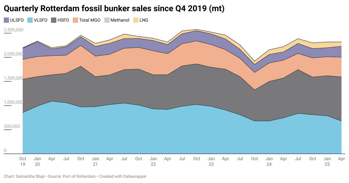 Changes in Rotterdam’s conventional fuel sales from the first to the second quarter of 2025: