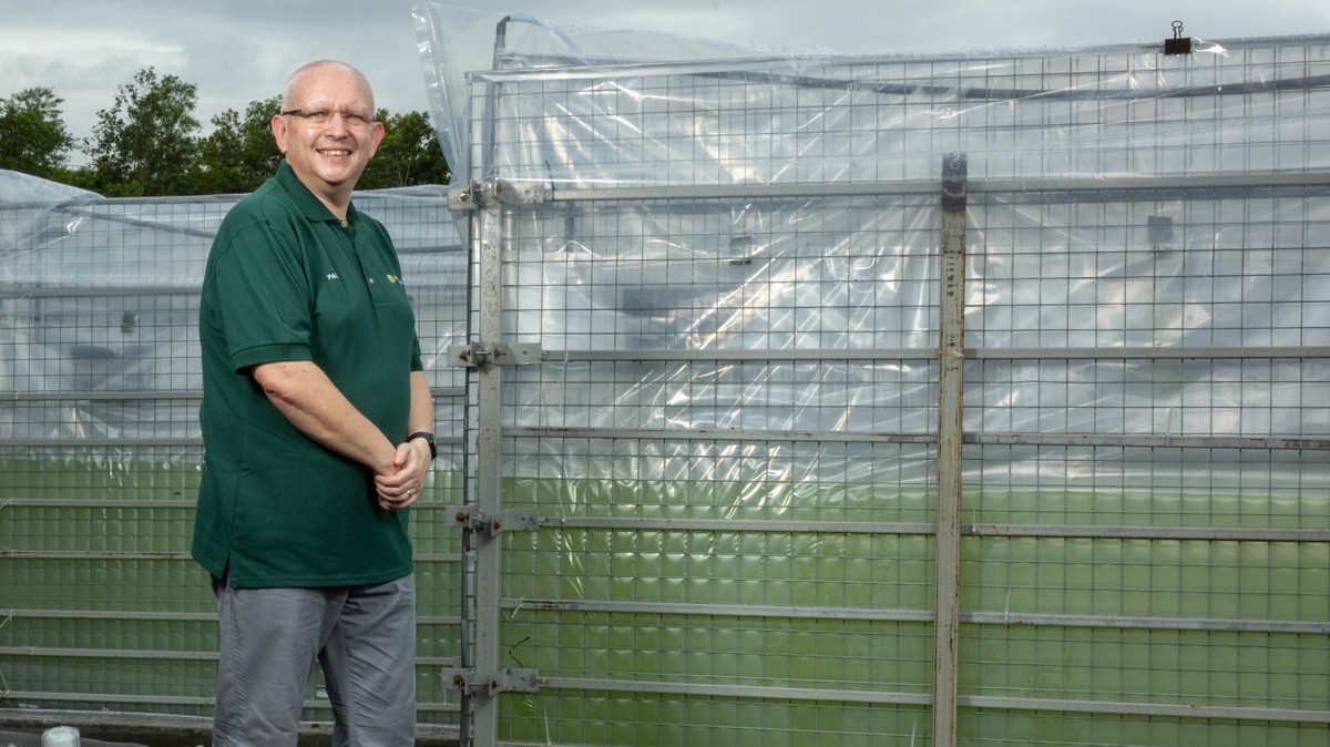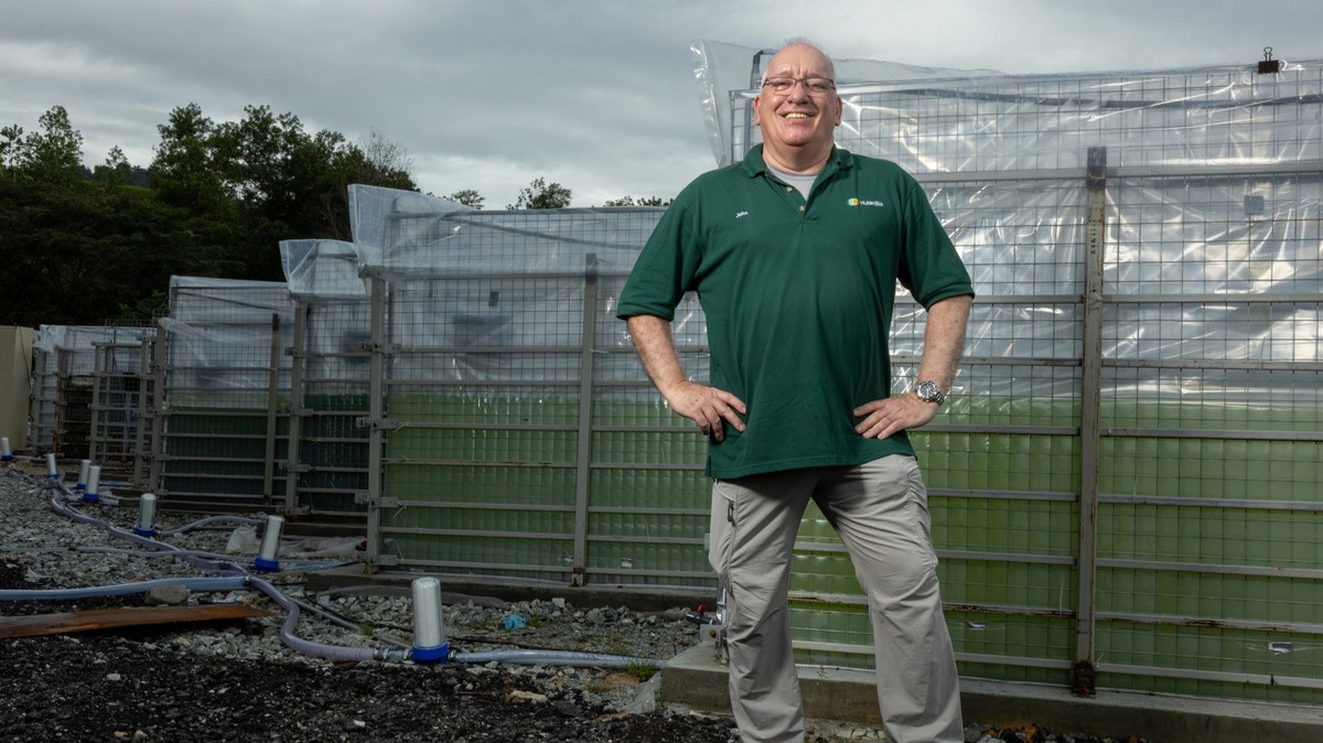 IMAGE: Chief executive Paul Beastall in front of first-generation photobioreactors filled with sea water and algae oil at a pilot site in Malaysia. The company is looking to scale to tonnes with its first commercial plant in either Morocco, Western Australia or the Middle East next year. HutanBio