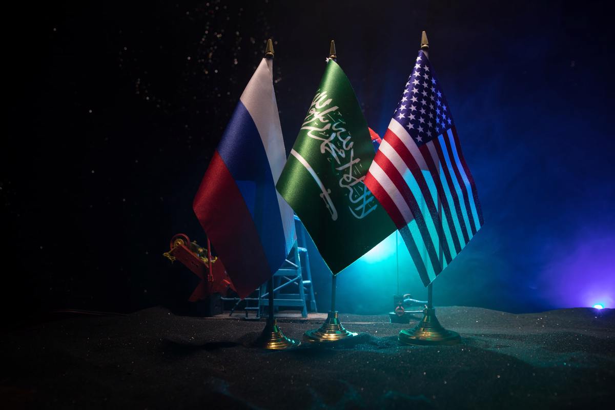 PHOTO: (L-R) Russia, Saudi and US flags against oil pump and oil refining factory at night. Getty Images