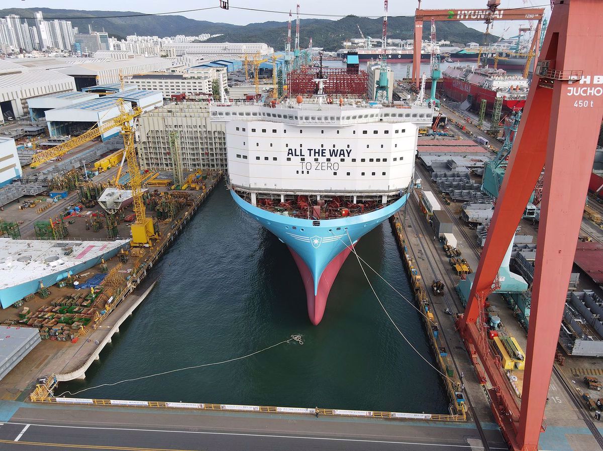 PHOTO: Maersk’s dual-fuelled methanol vessel at the HHI shipyard in South Korea. Maersk