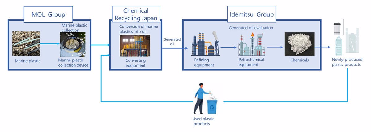 Japanese shipping line Mitsui O.S.K. Lines (MOL) and petroleum company Idemitsu Kosan have commenced a demonstration test on recycling marine plastic waste into fuel oil and petrochemical products.