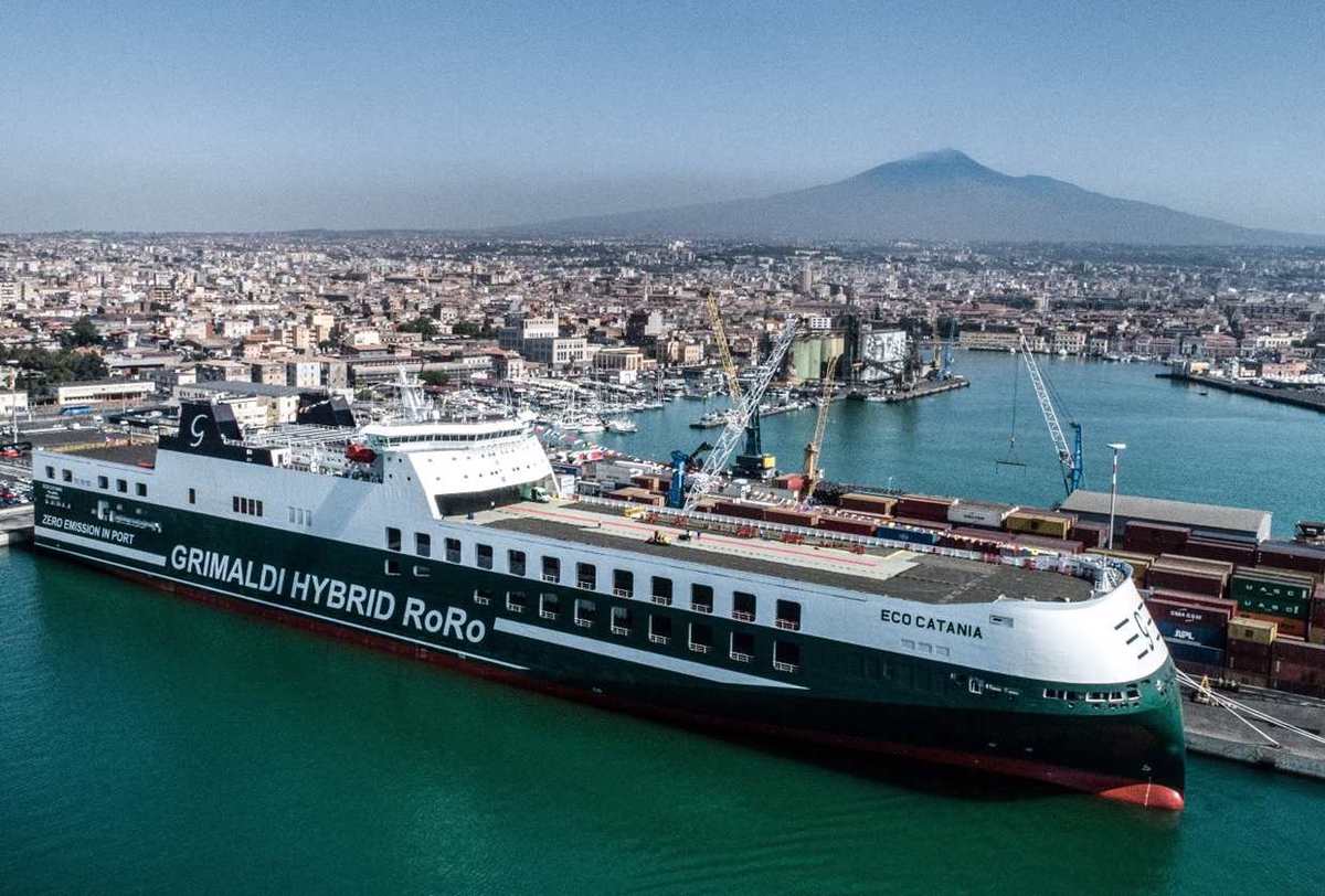 PHOTO: Grimaldi’s battery-hybrid ro-ro vessel Eco Catania at a port. Kongsberg Marine