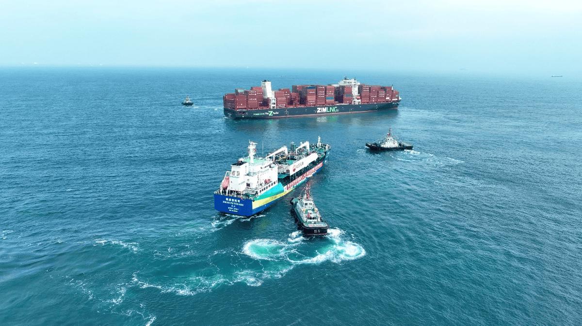 PHOTO: STS LNG bunkering of container ship, Zim Haifa Blue Stone. Kunlun Energy