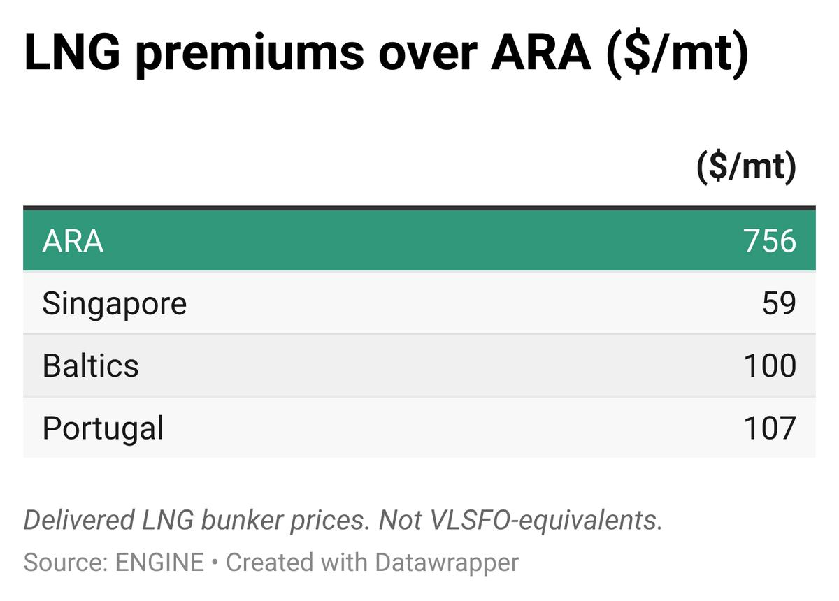 LNG bunker prices for delivery in the Baltics region and off Skaw are at premiums of around $100/mt over the ARA, and Sines in Portugal prices it around $107/mt on top of the ARA.