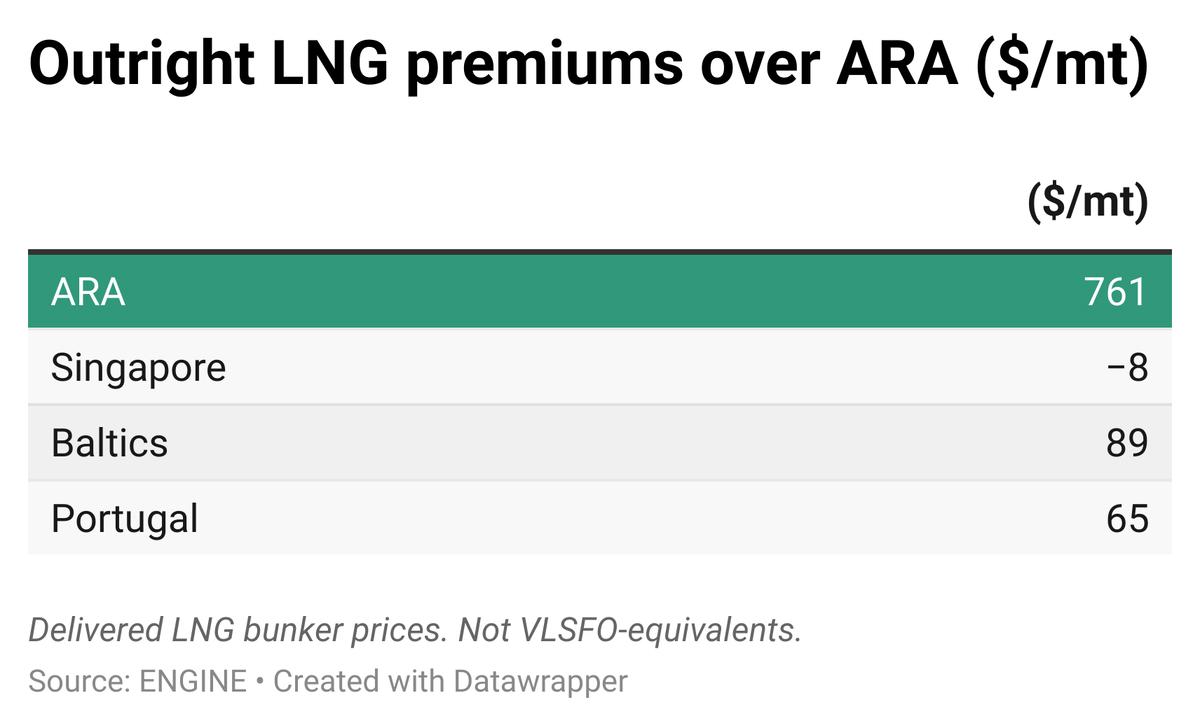 Rotterdam’s LNG bunker price has surged with support from a rising front-month Dutch TTF Natural Gas contract, which has gone up by $0.65/MMBtu on the week to $12.04/MMBtu ($626/mt).