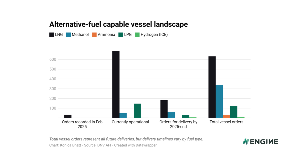 CHART: Alternative-fuelled vessel order landscape in February 2025. ENGINE, DNV