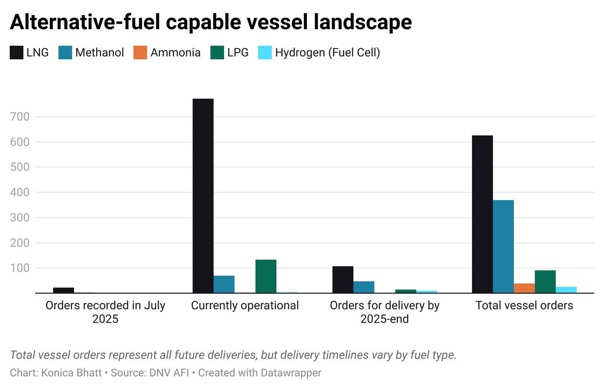 CHART: Alternative-fuelled vessel order landscape in July 2025. ENGINE, DNV