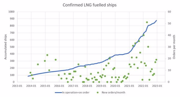 CHART: Confirmed orders of LNG-fuelled ships from 2013-2023. DNV via LinkedIn
