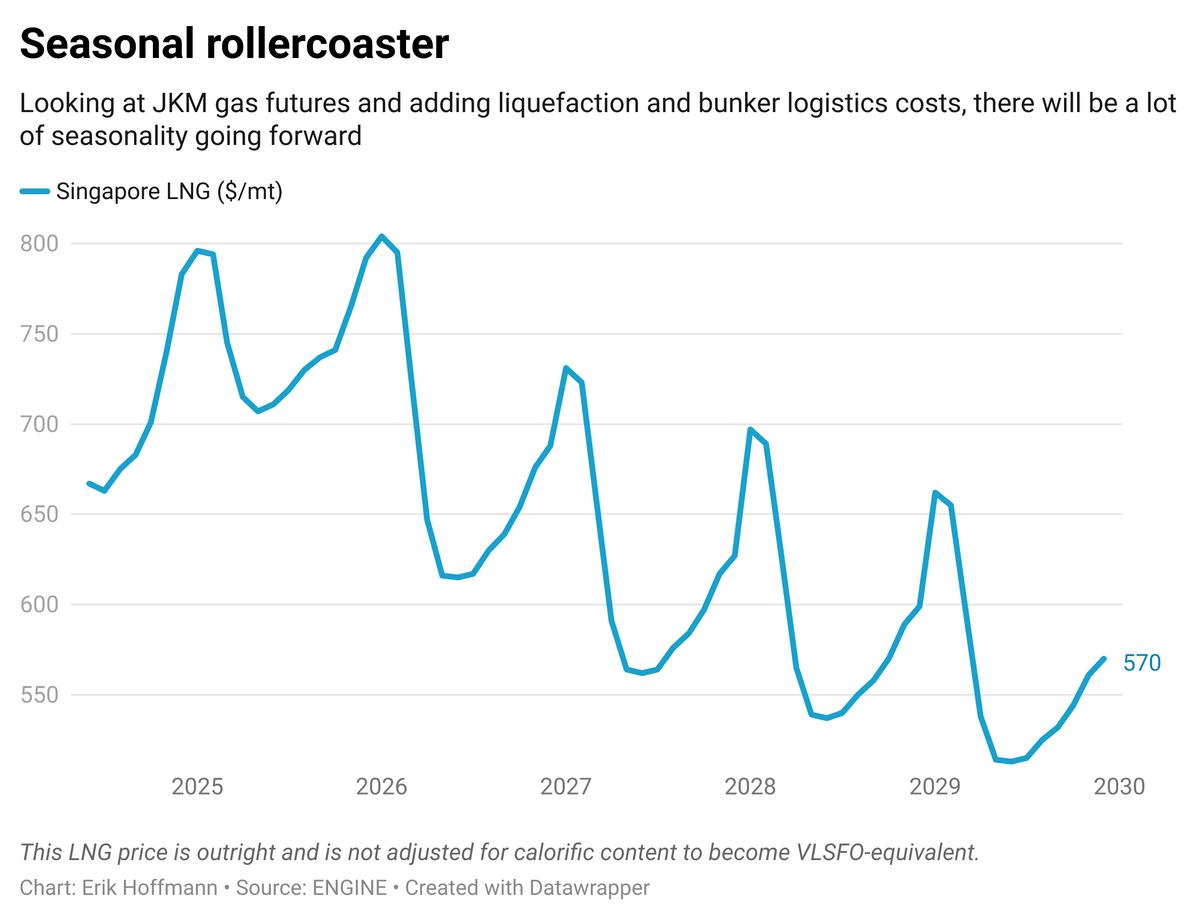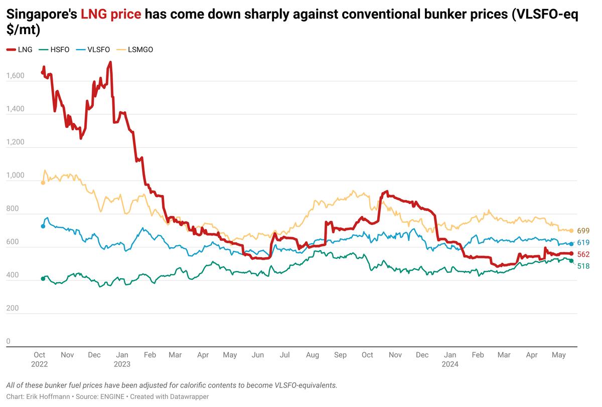 Last November, Singapore's LNG bunker price was over $900/mt, but coming into December it fell below $800/mt, making it cheaper than LSMGO in the port.