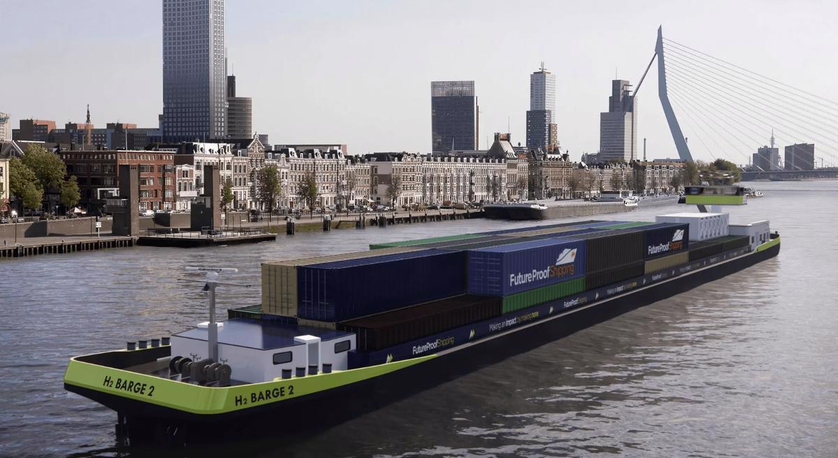 PHOTO: Green hydrogen-powered inland container vessel H2 Barge 2. FPS