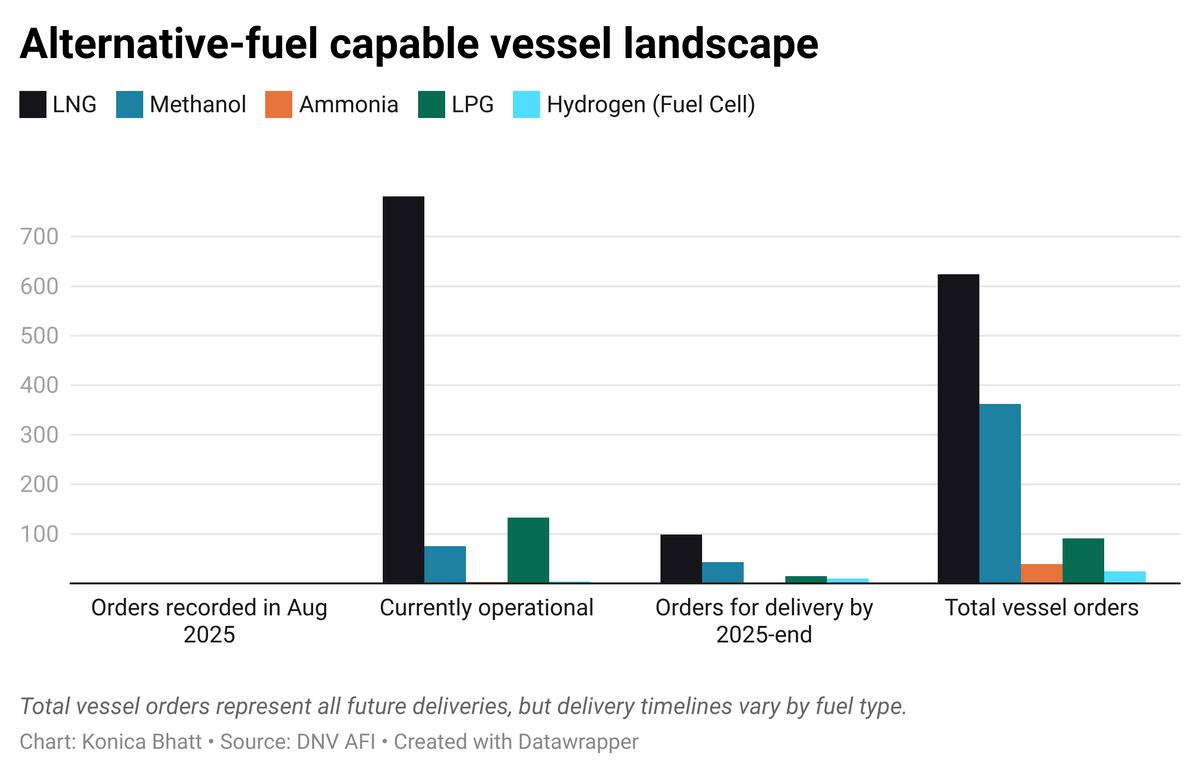 CHART: Alternative-fuelled vessel order landscape in August 2025. ENGINE, DNV