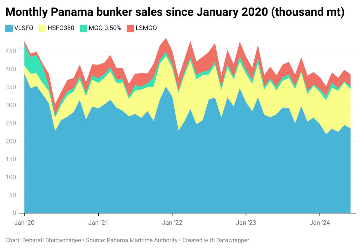 The number of ships bunkering in Panama’s ports rose from 480 in May to 516 in June – the highest since November 2023. The average stem size was roughly 750 mt in June, down from 830 mt in May, according to preliminary figures from the Panama Maritime Authority.