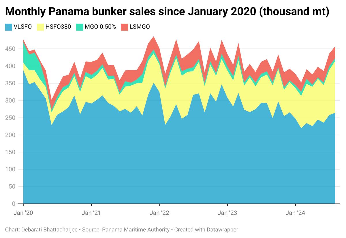 VLSFO continued to be the most sought-after product, accounting for 61% of total sales in Panama in the first eight months of this year. HSFO sales represented 29% of the total and combined MGO sales at 10%.