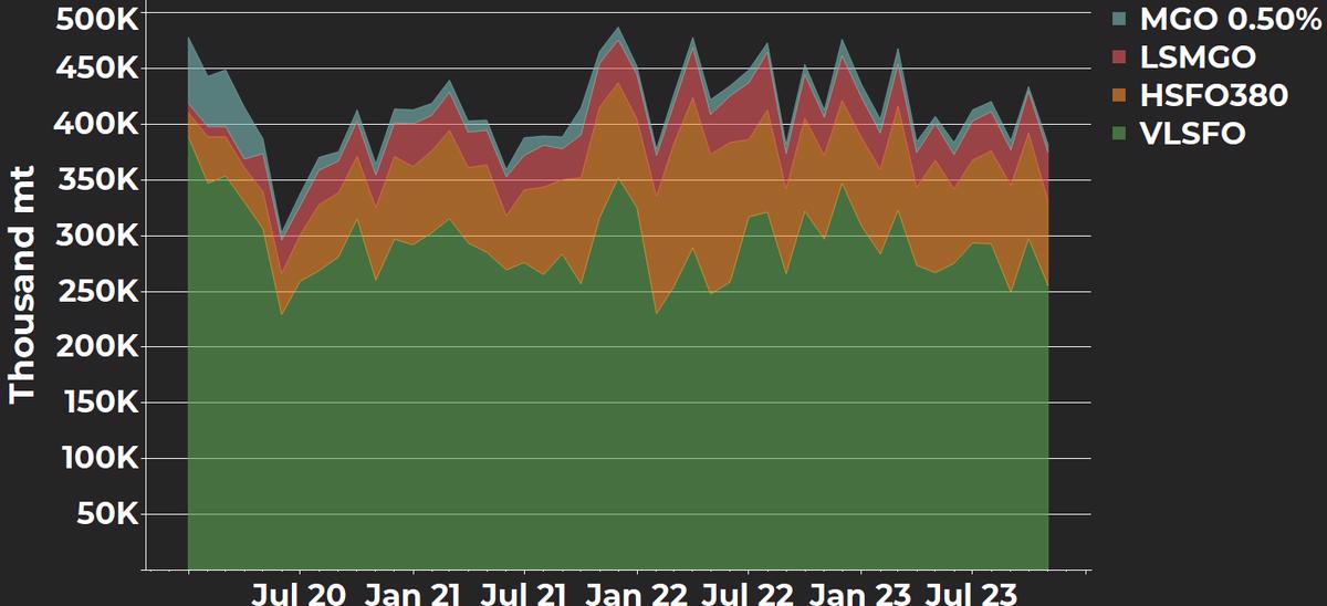 VLSFO sales declined by 14% on the month, while HSFO sales fell by 19%. However, LSMGO sales rose by 16% on the month, recording their highest sales level since August 2022.
