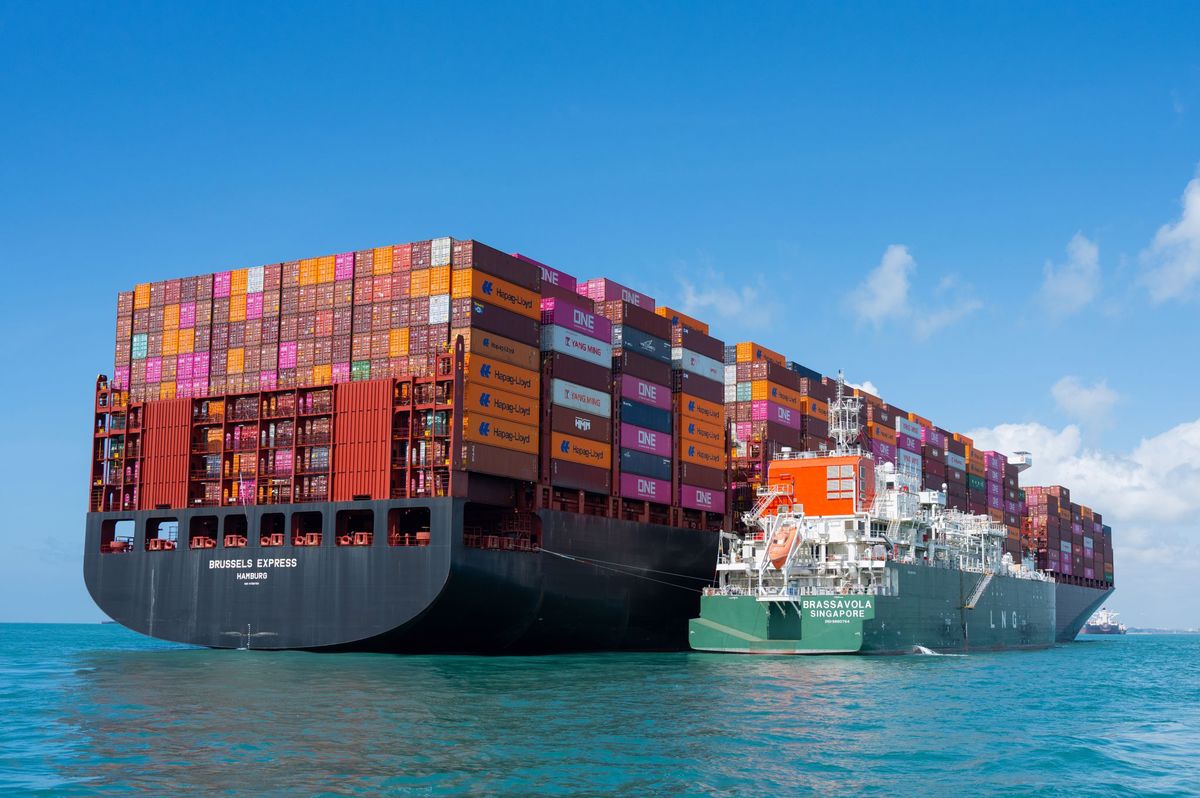 PHOTO: Pavilion Energy’s bunker vessel Brassavola delivering LNG to Hapag-Lloyd’s containership, Brussels Express in Singapore last week. Pavilion Energy