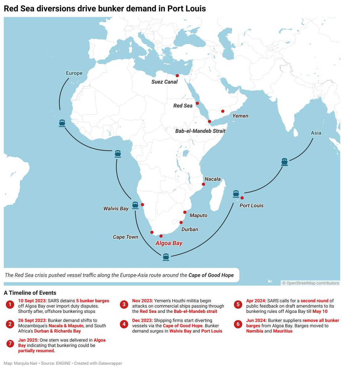 These regional disruptions redirected bunker demand in 2024 to alternative ports such as Port Louis, Nacala and Maputo in Mozambique, as well as Durban and Cape Town.