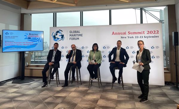 PHOTO: A briefing seminar last month, with Poseidon Principles chair Michael Parker (left), vice chair Paul Taylor (second from left), Poseidon Principles for Marine Insurance chair Patrizia Kern (second from right) and vice chair Rolf Thore Roppestad (right). Poseidon Principles