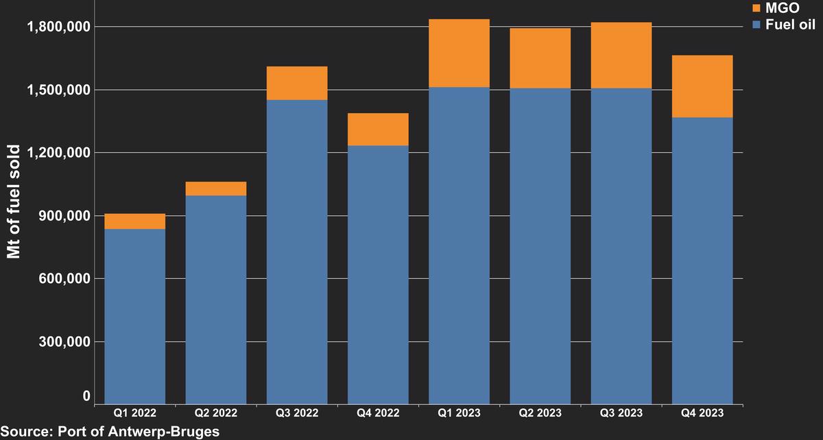 Zeebrugge’s total fuel oil sales declined by 15% in 2023, pulled down by a weak fourth quarter. Antwerp showed a 46% rise in fuel oil sales, backed by a 133% increase in the first quarter.